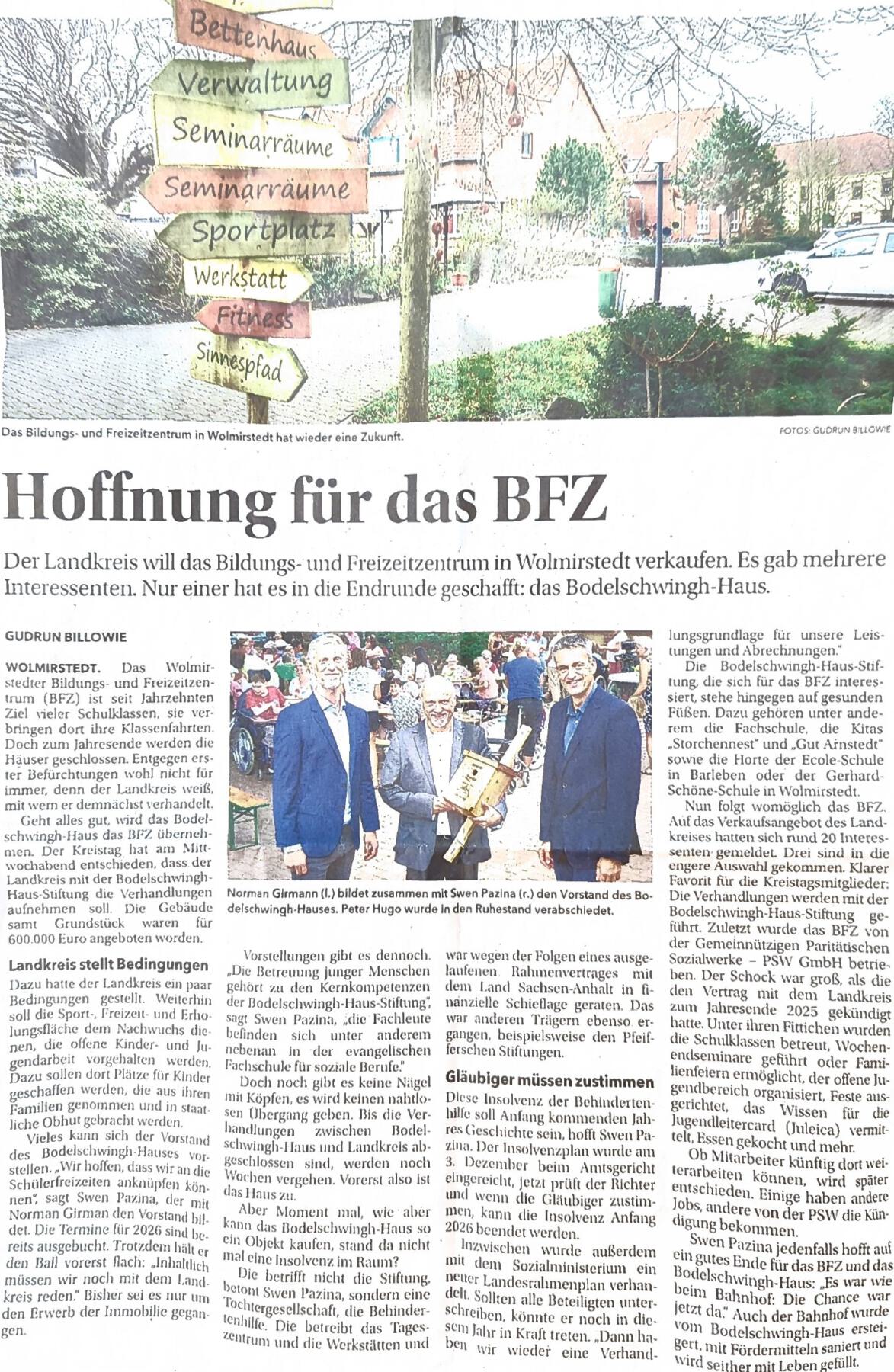 08.12.2025 – Es gibt einen neuen Artikel zum BFZ in Verbindung mit dem wahrscheinlich neuen Träger – der Bodelschwinghhaus Wolmirstedt Stiftung, welche unser Wunschkandidat war. Den Artikel können Sie hier (Klick!) einsehen.